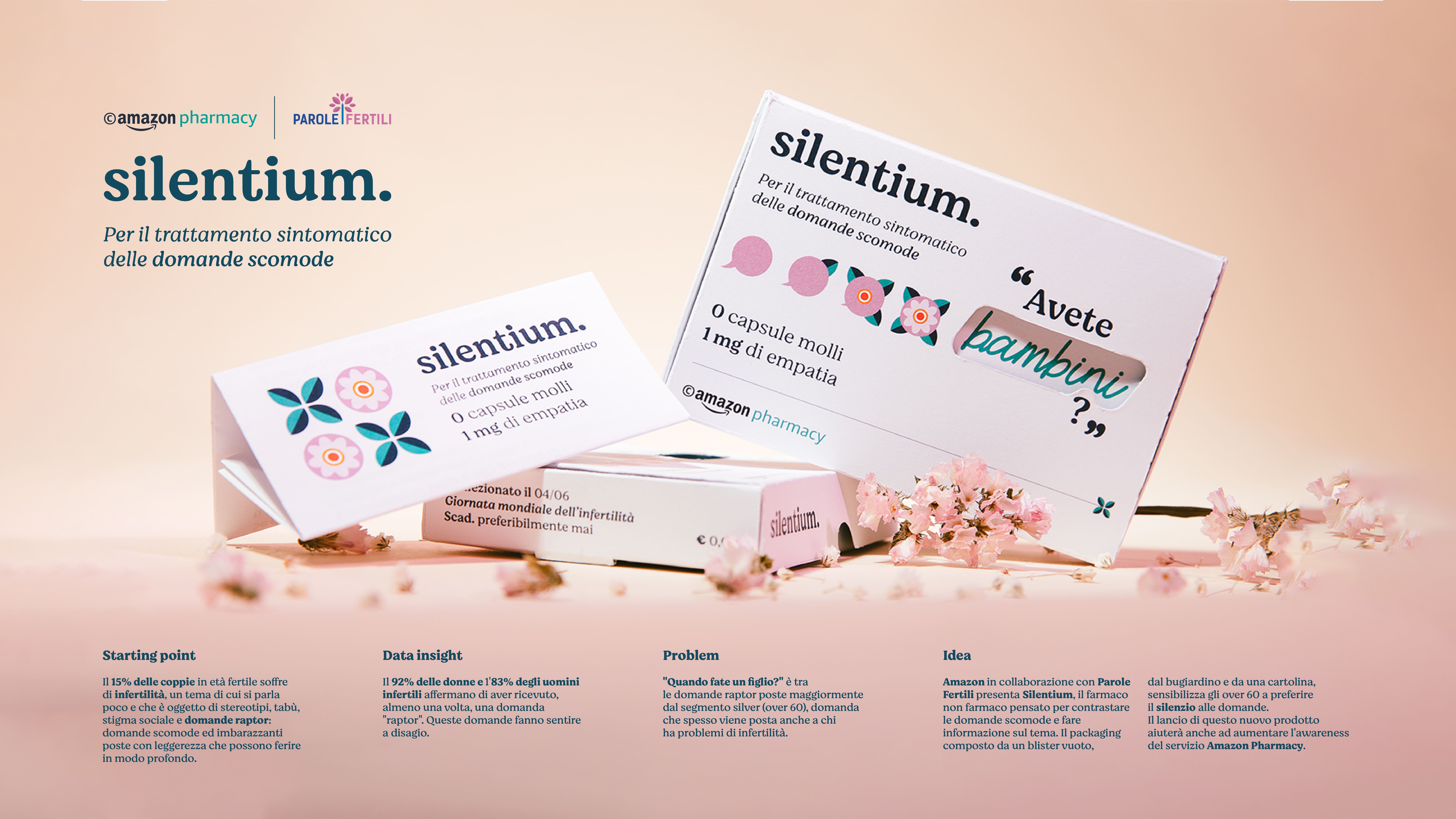 Amazon in collaborazione con Parole Fertili presentano Silentium un farmaco non farmaco che non solo invita ad evitare domande scomode ma che informa anche sul tema dell’infertilità.